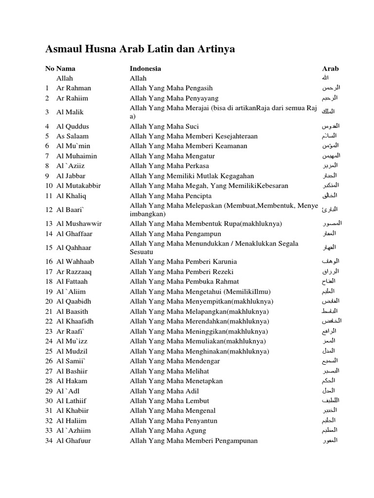 99 Asmaul Husna Artinya Makna Nama Nama Baik Allah Swt from mmc.tirto.id Check spelling or type a new query. Teks asmaul husna latin dan artinya. We did not find results for: Maybe you would like to learn more about one of these?